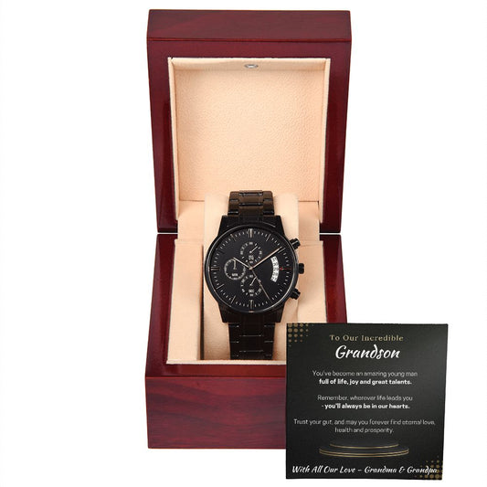 To Our Incredible Grandson - With All Our Love - Grandma and Grandpa Black Chronograph Watch
