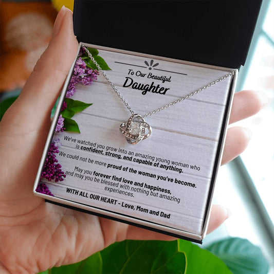 To Our Beautiful Daughter - With All Our Heart Love Mom and Dad - Love Knot Necklace