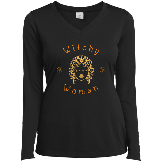 "Witchy Woman" Halloween Spirit Ladies’ Long Sleeve Performance V-Neck Tee