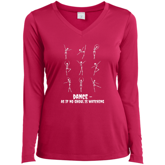 "Dance As If No Ghoul Is Watching" - Halloween Dancing Skeleton Ladies’ Long Sleeve Performance V-Neck Tee